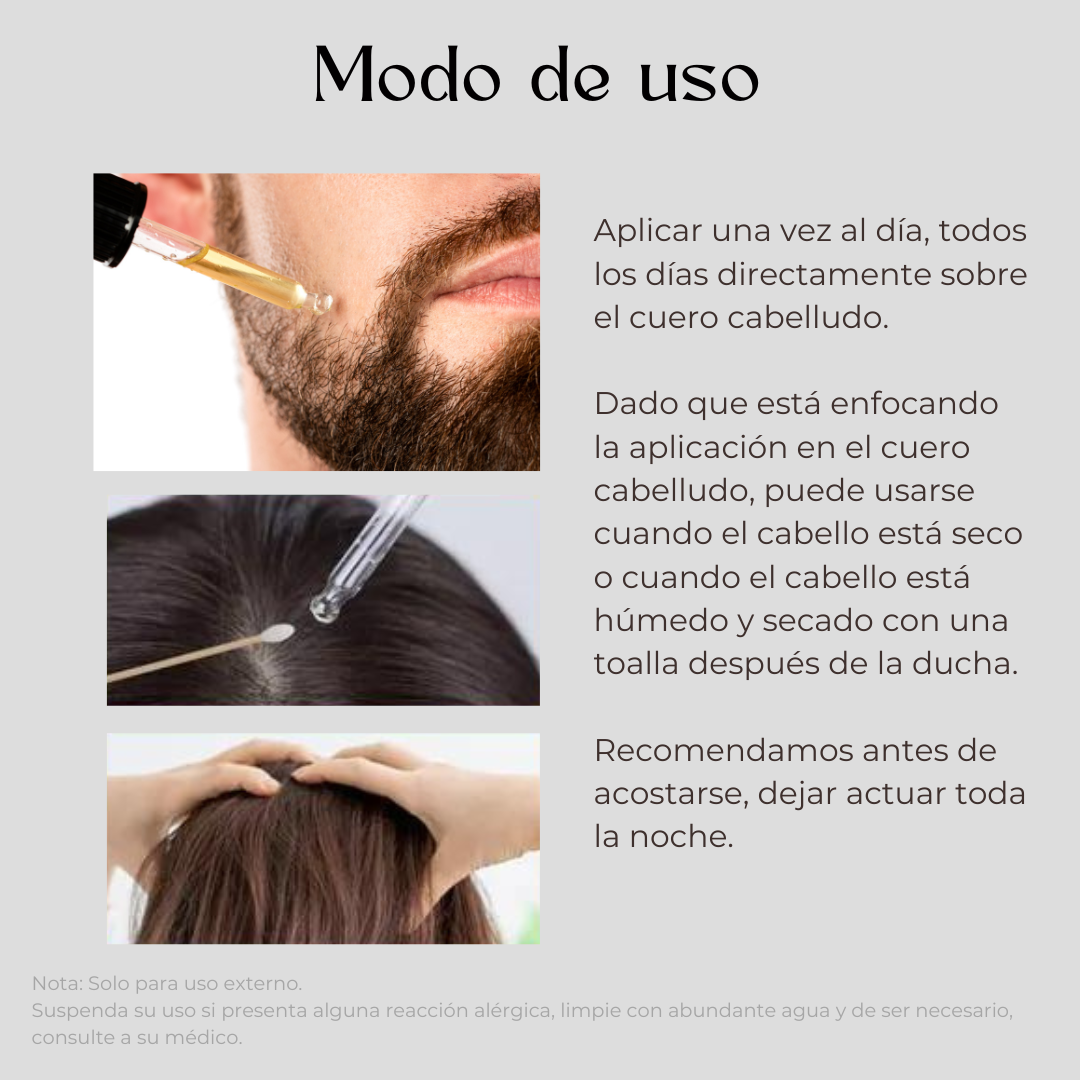 Aplicar una vez al día, todos los días directamente sobre el cuero cabelludo. Dado que está enfocando la aplicación en el cuero cabelludo, puede usarse cuando el cabello está seco o cuando el cabello está húmedo y secado con una toalla después de la ducha. Recomendamos antes de acostarse, dejar actuar toda la noche.